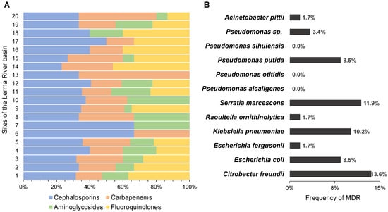 The distributions of the antimicrobial categories in each of the 20 sites were studied based on the results of the antimicrobial susceptibility test. The cephalosporin category is present throughout the Lerma River, followed by carbapenems, which are present in 18 of the sites (Figure 4A). These two ß-lactam categories together correspond to ≥40% of the AMR in every site. Moreover, fluoroquinolone and aminoglycoside resistance were observed in 15 sites each, but with a higher predominance of fluoroquinolone resistance, and following the proportions previously described in Figure 3. Overall, 17 sites presented AMR to more than three antimicrobial categories and only three sites (6, 7 and 13) showed the presence of two antimicrobial categories (see Figure 4A).