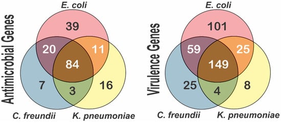 Additionally, we were also able to identify different virulence genes, including those coding for fimbriae (lpfA, fimA, and fimH), glutamate decarboxylase (gad), a hexosyltransferase homolog (capU), type IV pilin (ppdD), increased serum survival (iss), escape from the phagosome (dsbA), and invasion (ibeB, yijP, relA, aslA, ompA, and dam). Other genes detected were related to the formation of biofilms, capsule formation, immune evasion, and the secretory system, among others. This suggests that many of these enterobacteria can cause infections in human and animal hosts of clinical importance. The detection of antimicrobial and virulence genes in the genomes of the species sequenced showed a greater number of unique genes in E. coli compared to C. freundii and K. pneumoniae. In fact, no unique genes of either class were detected in C. freundii, but many were shared with E. coli (Figure 5).