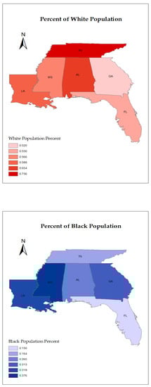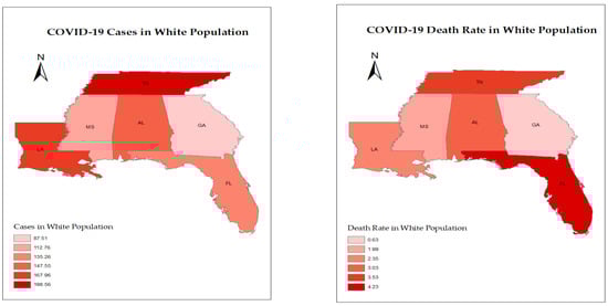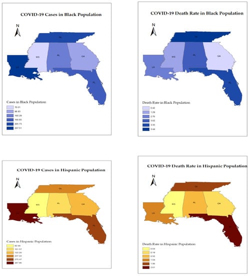Further, GIS maps were created using the ArcGIS software package (ESRI: Redlands, CA, USA; V 10.8.2) [27]. Maps were created for the COVID-19 cases and death rates based on the racial differences in the selected states. GIS maps helped visualize the geographical content and understand relationships and patterns in the study areas.