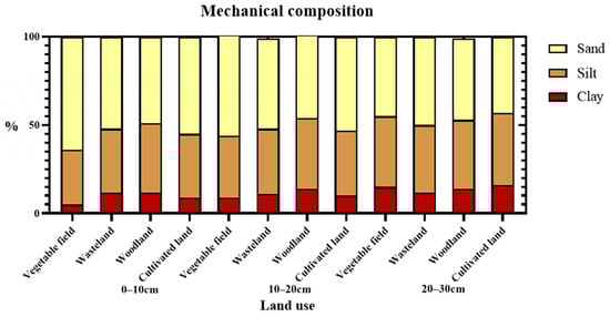The soils’ textures were classified and divided into sand, silt, and clay, according to the percentage of these components in the soil. The particle size of sand was defined as 0.02–2 mm, while that of silt was defined as 0.002–0.02 mm, and that of clay was below 0.002 mm. In the soil layer between depths of 0–10 cm, the sand content varied among different land use types as follows, in descending order: vegetable field > cultivated land > wasteland > woodland. The silt content varied as follows, in descending order: woodland > cultivated land > wasteland > vegetable field. The clay content varied as follows, in descending order: woodland > wasteland > cultivated land > vegetable field. In the soil layer at depths between 10–20 cm, the sand content varied as follows, in descending order: vegetable field > cultivated land > wasteland > woodland; for silt content: woodland > wasteland > cultivated land > vegetable field; and for clay content: woodland > wasteland > vegetable field > cultivated land. In the soil layer at depths between 20–30 cm, the sand content varied as follows, in descending order: wasteland > woodland > vegetable field > cultivated land, whereas silt and clay exhibited the following identical order of variation: cultivated land > vegetable field > woodland > woodland > wasteland (Figure 2).