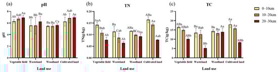 (a) Soil pH; (b) total nitrogen in soil (TN), and (c) organic matter in soil (SOM) for different land use types in the Taojia River basin. The values are means ± SE. Note: The difference is not significant if there is a letter with the same marker, and significant if there is a letter with different markers. Upper case letters indicate the difference between different land uses within the same soil layer. Lower case letters indicate the difference between different soil layers within the same land use pattern.