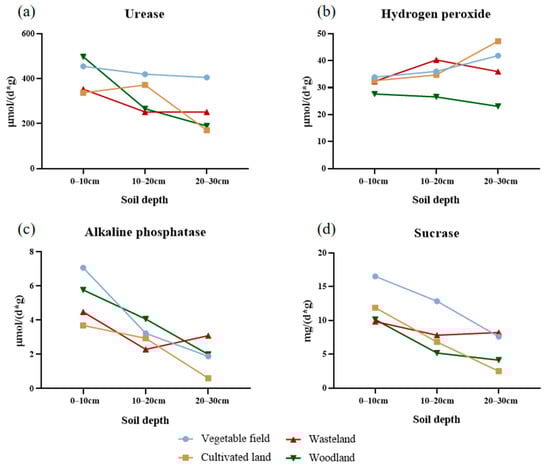From the perspective of different soil layers at depths between 0–10 cm, the content of urease under different land use types decreased as follows: woodland > vegetable field > cultivated land > wasteland (Figure 4a). The content of hydrogen peroxide enzymes decreased as follows: vegetable field > cultivated land > wasteland > woodland (Figure 4b). The content of alkaline phosphatase decreased as follows: vegetable field > woodland > wasteland > cultivated land (Figure 4c). The content of sucrase decreased as follows: vegetable field > cultivated land > woodland > wasteland (Figure 4d). At depths between 10–20 cm, the content of urease decreased as follows: vegetable field > cultivated land > woodland > wasteland (Figure 4a). The content of hydrogen peroxide enzyme decreased as follows: wasteland > vegetable field > cultivated land > woodland (Figure 4b). The content of alkaline phosphatase decreased as follows: woodland > vegetable field > cultivated land > wasteland (Figure 4c). The content of sucrase decreased as follows: vegetable field > waste land > cultivated land > woodland (Figure 4d). At depths between 20–30 cm, the content of urease decreased as follows: vegetable field > wasteland > woodland > cultivated land (Figure 4a). The content of hydrogen peroxide enzymes decreased as follows: cultivated land > vegetable field > wasteland > woodland (Figure 4b). The content of alkaline phosphatase decreased as follows: wasteland > woodland > vegetable field > cultivated land (Figure 4c). The content of sucrase decreased as follows: woodland > vegetable field > woodland > cultivated land (Figure 4d). Concerning the trends regarding the change in enzyme activity, the activity of urease in the soil increased with the sampling depths. The activity of urease in vegetable fields, wasteland, and woodland all decreased, and the activity in cultivated land increased first and then decreased. At deeper sampling points, the activity of hydrogen peroxide enzymes in vegetable fields and cultivated land gradually increased, and the activity in wasteland first increased and then decreased. The activity of hydrogen peroxide enzymes in woodland gradually decreased. The activity of alkaline phosphatase increased at deeper sampling points. The activity of alkaline phosphatase in vegetable fields, cultivated land, and woodland gradually decreased, and the activity in wasteland first decreased and then increased. The activity of sucrase increased at deeper sampling points. It decreased in vegetable fields, cultivated land, and woodland. In wasteland, it first decreased and then increased.