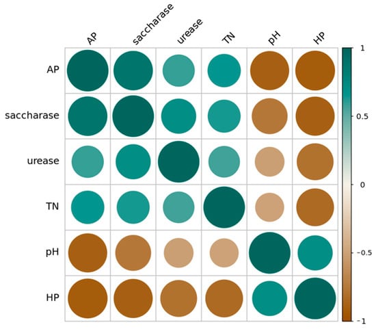 The analysis of the enzymatic activity of four soil enzymes, namely, urease, catalase, alkaline phosphatase, and sucrase, showed a significant positive correlation between urease and alkaline phosphatase (p < 0.05), a highly significant positive correlation between urease and sucrase (p < 0.01), and a highly significant positive correlation between alkaline phosphatase and sucrase (p < 0.01) (Figure 5). These correlations indicate that urease activity relates to and interacts with alkaline phosphatase activity in the soil and that sucrase activity, urease activity, and alkaline phosphatase activity relate to and interact with one another.