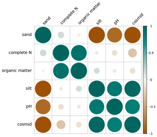 The content of clay in the soil had a significant positive correlation with the content of silt, a significant negative correlation with the content of sand, and a significant positive correlation with the pH value. The content of silt had a significant negative correlation with sand, a significant positive correlation with the pH value, a significant positive correlation with the content of the organic matter in the soil, as well as a significant positive correlation with the content of total nitrogen in the soil (Figure 6). The content of total nitrogen had a significant positive correlation with the content of total phosphorus in the soil.