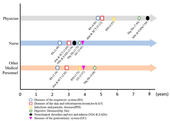 In our study, we design the worker’s career start date as the baseline for the life trajectory, and listed the top five systemic diseases that medical workers developed most quickly after they began working in medical institutions and compared the results between the three categories of medical personnel. Both the types and order (regarding the time sequence of development) of diseases were similar between the three categories. This may indicate that the reason for medical workers to develop systemic diseases was not due to personal factors or habits. Rather, the diseases may have resulted from a similar working environment or other common factors. Although the results of Table 2 indicate that only two systemic diseases were significant with the occupations in our research, a similar diagnosis sequence observed in Figure 1 is still exciting. The diagnosis sequences in three occupations are coincidentally similar, this diagnosis sequence result may indirectly indicate that the systemic diseases in Figure 1 present significantly with certain occupations; and the authors may be limited by the database or undiscovered influencing factors. Future studies may further investigate this topic. This study also revealed that the average period before physicians developed systemic diseases was longer than that for the other two groups. This may be because physicians have more knowledge related to medicine and diseases [].
