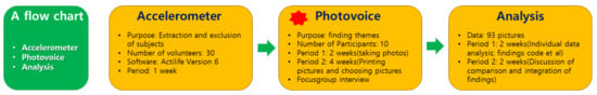 The photovoice study, which is the core of this study, was conducted with the final ten people selected through accelerometer data and expert meetings. In North America, photovoice research has recently expanded to the field of Kinesiology [37]. The present study is based on a protocol developed by Baker and Wang and modified by Kim, which is divided into three main stages: orientation, photovoice implementation, and focus group interview [43].