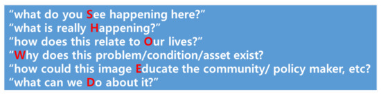 As a result of this process, 93 photos were acquired in total. At the discretion of the researcher, reduplicated photos, and not appropriate printed photos were excluded or important photos were added. The ten participants in this research also got involved in this classification work through pilot interviews and telephone conversations and selected up to four photos they thought were important. In the end, a total of 17 photos were selected that both research participants and researchers agreed were the most meaningful. A focus group interview of these selected photos was conducted with field memos. The SHOWeD technique was employed [37] to lead the focus group interview. The SHOWeD technique is described in Figure 2.