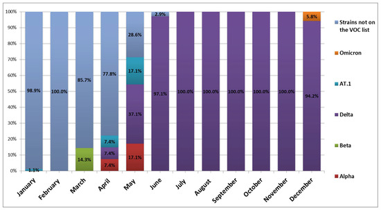 Since SARS-CoV-2 genotyping was not performed at the time of illness, the inclusion criterion was date of illness. We also relied on surveillance data for viral genetic variants circulating in St. Petersburg in 2020, which showed several trends. During routine study of SARS-CoV-2 genetic diversity from January 2021 until January 2022, 846 nasopharyngeal swabs from patients with COVID-19, admitted to hospitals or health centers located in Saint Petersburg, were collected and delivered to the Saint Petersburg Pasteur Institute for analysis as part of a related study. All samples of sufficient quality underwent sequencing and phylogenetic analysis [9]. Until the beginning of March 2021, non-VOC genetic variants were detected in the vast majority of cases. Starting from June, the SARS-CoV-2 genetic landscape changed completely. Up to the end of 2021, the delta (B.1.617.2) genetic variant, a VOC, was detected in the vast majority of cases (Figure 1).