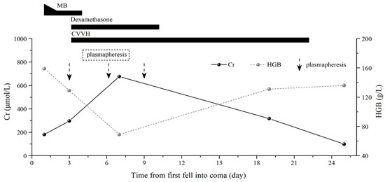 On the third day after onset, the patient recovered from coma. He had a mini-mental state examination (MMSE) score of 27, had no cognitive impairment, was off the ventilator, and was extubated. However, anuria, scleral jaundice, elevated indirect bilirubin, and a rapid decline in hemoglobin levels were observed on the same day. Based on this, the patient was judged to have hemolytic anemia. He was treated with dexamethasone 40 mg daily, continuous veno-venous hemofiltration (CVVH), and three plasmapheresis sessions (Figure 1). On the 10th day of onset, the urine output of the patient increased to 400 mL. Plasmapheresis and dexamethasone were discontinued, and CVVH therapy was continued.