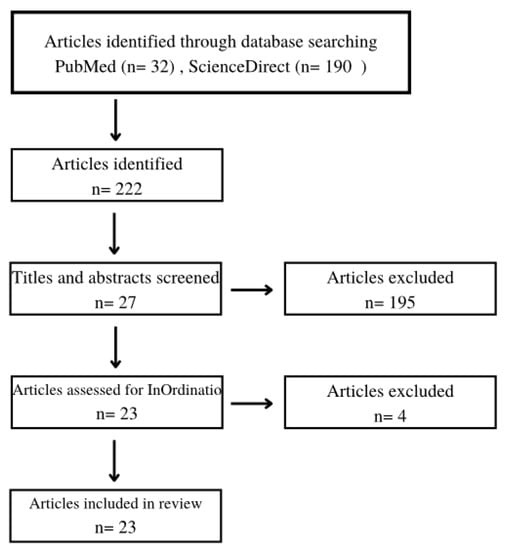 A total of 222 articles were found in the literature search. After applying the eligibility criteria, the pre-selection process (title and abstract reading) provided 27 articles. These articles were submitted to the Methodi Ordinatio equation, considering the scientific quality of each work, and the final selection resulted in 23 studies, which composed the bibliographic collection of this review. The flowchart of the study selection process was reported in Figure 1. Based on the pre-selection criteria, we excluded 195 articles that did not suit the theme. Another four articles were excluded during the final selection process considering the InOrdinatio value.