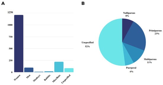 Studied populations (A) and female classification (B) found in the analyzed studies.