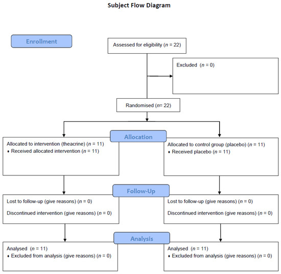 The subjects were randomized and divided into two groups using Random Allocation Software [22]. One of the groups received capsules with 200 mg of theacrine (T group), while the other group received placebo capsules, which were equal in weight and size (P group). On the day of the second battery of tests, a member of the team distributed the capsules, which the subjects ingested 60 min before the tests.