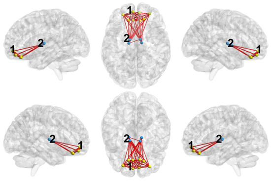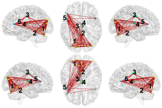 - Xia, M.; Wang, J.; He, Y. BrainNet Viewer: A Network Visualization Tool for Human Brain Connectomics. PLoS ONE 2013, 8, e68910. [Google Scholar] [CrossRef]