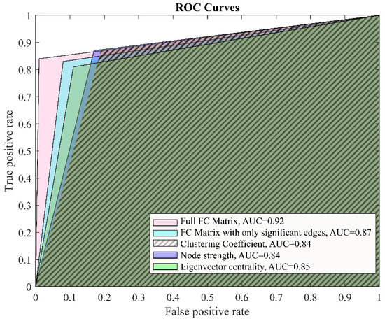 Employing LDA, we explored the accuracy of the diagnostic classification based on different connectivity measures. As seen in Table 6, all methods were suitable for classification purposes (precision of at least 80%), although the best results obtained from the LDA were full functional connectivity matrices. An illustration of the results are given in Figure 4, where the ROC curves are presented.