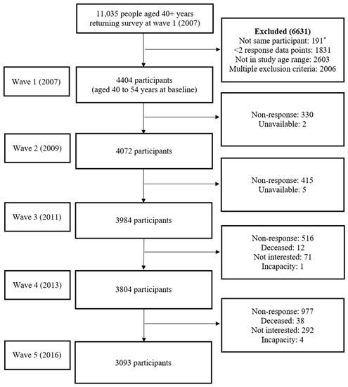 The current study used data from all five waves of HABITAT with an analytical sample of 4404 respondents aged 40 to 54 years at baseline. This ensured that participants remained in the mid-age bracket at all available time points, i.e., 2009, 2011, 2013, and 2016. Analyses included those who had data collected at two or more waves. Figure 1 presents the flowchart of the derived analytic sample and participant attrition throughout the study period. Longitudinal inconsistencies in the dataset (e.g., changes in gender from baseline) were reviewed with 191 cases excluded due to suspected change in respondent across waves. All participants were sent the questionnaire at each timepoint (even if there was no response previously) with the exception of participants who were deceased, and those who advised that they were not interested in study participation, unavailable (e.g., travelling overseas) or incapable due to a physical or mental condition.