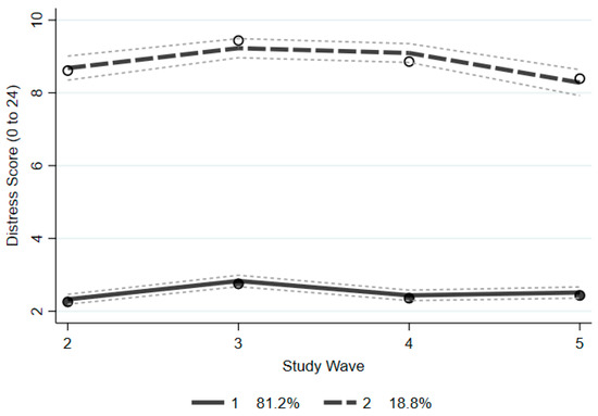 Group-based trajectory modelling (GBTM) was conducted within STATA using the TRAJ command to identify heterogenous psychological distress trajectory subgroups over time [38]. A two-stage model selection process was used to identify the optimum number of trajectory groups whilst also considering the description of raw data, model parsimony, and theoretical relevance. The adequacy of the distinctly different longitudinal trajectories was tested using the initial null model for comparison. The final number of groups and polynomial order was determined by examining difference between model Bayesian Information Criterion (BIC) via an approximate Bayes factor (Bij), obtaining close correspondence between the estimated probability of group membership and the proportion assigned to the group, average posterior probability of subgroup membership for the assigned model with acceptability set to ≥0.7 (values close to 1 indicating higher precision), odds of correct classification based on posterior probabilities of group membership ≥ 5, narrow confidence intervals around group membership probabilities, and the proportion of participants in each group [39,40,41,42]. Chi-square tests of homogeneity were conducted for each sociodemographic variable to examine the distributions between the two distress level groups identified by the GBTM analyses.