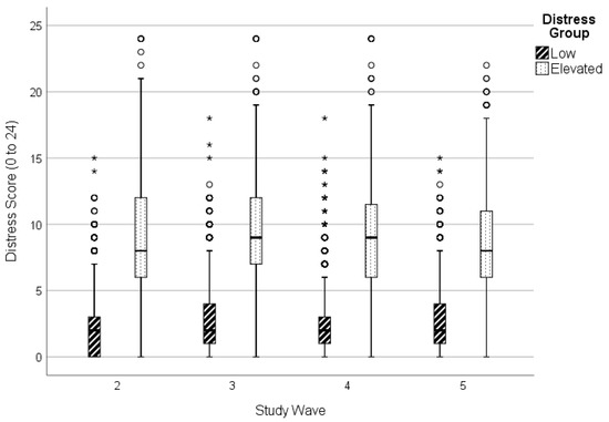 Psychological distress scores over time in low and elevated distress trajectory groups. ◦ Outlier beyond 1.5 times interquartile range. * Outlier beyond 3 times interquartile range.
