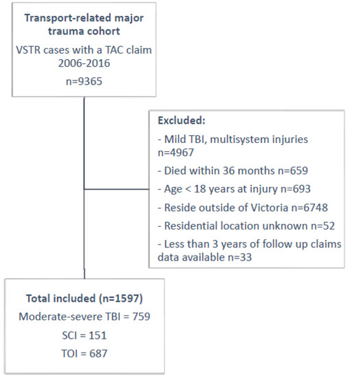 Victorians who sustained major trauma from a transport-related event between 1 January 2006 and 31 December 2016 with a TAC compensation claim were identified within the VSTR. People were included if they sustained isolated orthopaedic injuries; a moderate to severe TBI or SCI; were aged 18 years or older at the time of injury; had three-years of TAC claims data; and resided in Victoria with a known residential address (Figure 1). The orthopaedic group consisted of people who had sustained an extremity injury with AIS score >1 and/or spine injury with AIS two or three and no other injury with AIS >1 [15]. Traumatic brain injury (TBI) cases were considered to be moderate or severe if they had a head injury with an AIS severity score >2 and the first recorded Glasgow coma scale (GCS) score <13, with or without other system injuries [15]. Mild traumatic brain injuries are not captured by the VSTR unless sustained with other system injures so were excluded from this study. Spinal cord injury was defined as an injury to the spine with an AIS severity score >3, with or without other injuries [15].