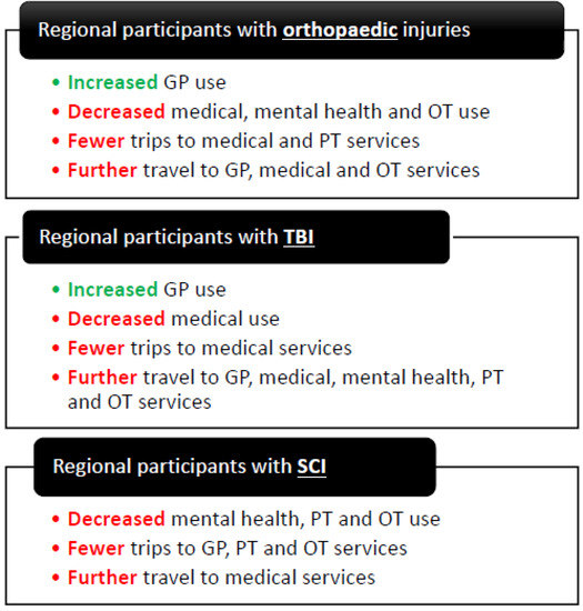 Figure 3 provides a summary of the key findings from the multivariable regression analysis for service use, number of trips, and distances travelled to services. More specific results from the models for each outcome and injury group are reported in each section below.