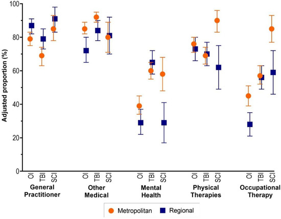 The adjusted proportions of people using GP services were higher for regional participants in all injury groups (Figure 4). Across all other services, the adjusted proportions for service use were greater for people living in major cities compared with people living in regional areas, except for people with TBI accessing mental health services.