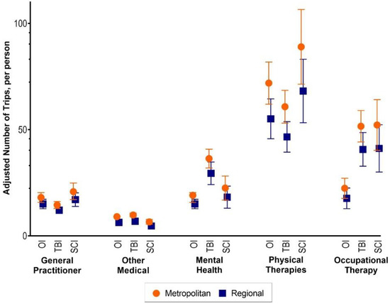 For all injuries and service types, people in regional areas used fewer services than people residing in major cities after adjusting for covariates (Figure 5). Physical therapies were the most commonly used service across all injury groups. In the orthopaedic group, the mean number of trips for participants in regional areas, compared with major cities, was 29% lower for medical services and 24% lower for physical therapy services. In the TBI group, the mean number of trips for participants in regional areas, compared with major cities, was 35% lower for medical services. In the SCI group, the mean number of trips for participants in regional areas, compared with major cities, was 35% lower for GPs, 37% lower for physical therapy and 45% lower for OT services (Table 3).
