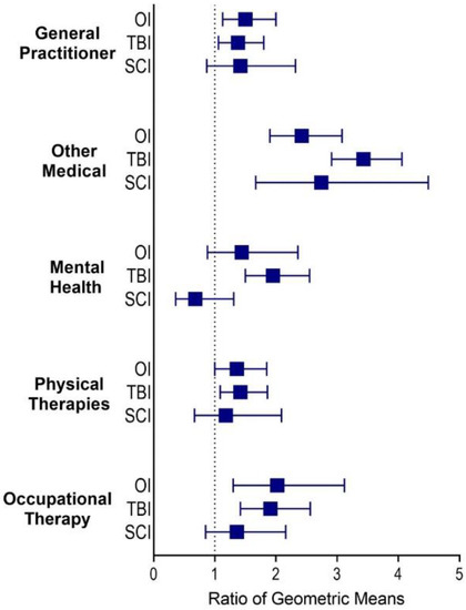 In the TBI group, participants in regional areas travelled significantly further to access all post-discharge health services compared with participants in major cities (Figure 6). In the SCI group, however, participants in regional areas travelled further only to attend medical services (RGM 2.66, 95%CI 1.63–4.36) (Figure 6). In the orthopaedic group, participants in regional areas travelled 1.4 times further to see a GP (95%CI 1.06–1.88), 2.26 times further to attend other medical services (95%CI 1.76–2.89), and 1.7 times further to OT services (95%CI 1.06–2.62) compared with participants in major cities.
