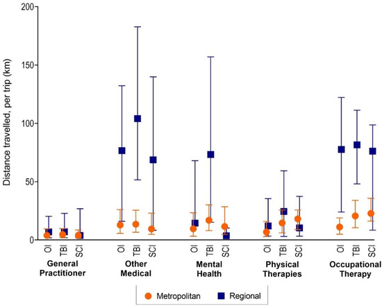 In this study, we found that for all injury types, people living in regional areas travelled further than people in metropolitan areas to access all services. However, after adjusting for covariates, our findings were more nuanced. People living in regional areas with TBI travelled significantly further to all health services than those in metropolitan areas, whereas for people with SCI, a significant difference was only found for travel to medical services, which was based on region. Due to the complexity and long-term issues associated with SCI, people with SCI may choose to live in areas where they can access necessary services [24]. In comparison, given the varying degree of severity of TBI, some people with TBI may place less importance on ease of service access and availability when deciding where they want to reside. These novel findings reinforce the importance of specialised telehealth services and outreach clinics for people in regional areas with TBI to reduce travel burden and ensure access to adequately skilled healthcare services.