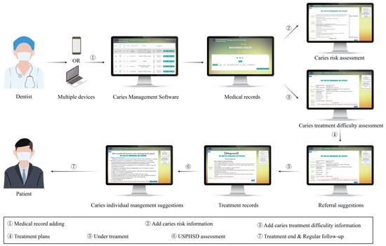 To make it more convenient to use this assessment, we chose Python to build a cloud platform of Dental Caries Management Software. To keep track of different patients, the software considers the risk degree of patients, the state of each lesion, patient management, clinical management, and monitoring. In general, it can achieve the following functions: 1. The software can synchronize data from multiple devices, such as mobile phones, iPads and computers, which means that the software can be used in the clinic to gather information from individual cases to population distribution. 2. For dentists, the software can provide a collection of patient data, detailed treatment process records, caries risk assessment and treatment difficulty assessment details to facilitate population data analysis. 3. For patients, the software can automatically provide a clear map of the level of caries risk and treatment difficulty, then provide personalized suggestions on caries management, which is conducive to the communication between dentists and patients. To sum up, the expected targets of the Caries Management Software are to reduce the incidence of caries, help individualized caries management, maintain dental health, improve patient satisfaction, and improve the prognosis of caries treatment. The process of using this software is shown in Figure 1.