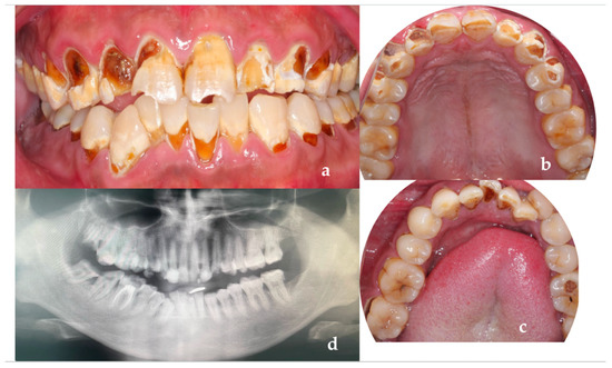 A 26-year-old male patient came to our clinic because of spontaneous pain in his right posterior tooth for one week. The patient had no systemic disease, and the family history showed no abnormalities. He described his job as a waiter with no exposure to acid substances. However, he loves to drink Coca-Cola and drinks more than 1 L of Coca-Cola every day; he also loves snacks and brushes his teeth less than once a day. These are the main causes of his dental caries. Dental examination found that the patient had poor dental hygiene with I-II° calculus supragingival and subgingival. All his teeth had extensive caries on the cervical region of the buccal and labial surfaces. The caries of teeth #14–24 even invades the tooth cusps. No lesions were found in the palatal and lingual surface. The pulpal surfaces of erosive lesions contained brown-colored, leathery, carious dentin. None of the pulp cavities were involved and the teeth remained asymptomatic on percussion, palpation and cold testing, except for tooth #46. The patient’s toothache came from tooth #46. There were two visible holes in teeth 46 buccal and occlusal surface, the perforation could be detected in the buccal surface, and the probing pain was obvious. There was no pain on percussion but severe pain on cold testing and heat testing (Figure 2a–d).