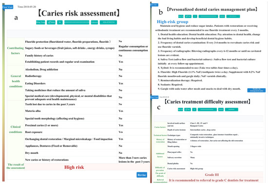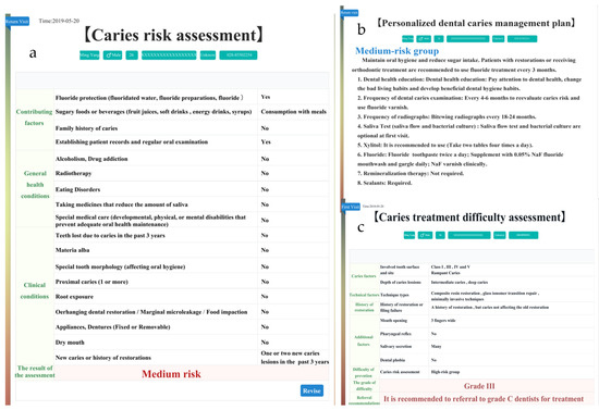 (a) Caries Risk Assessment Form of return visit; (b) Personalized caries management plan of return visit; (c) Caries treatment difficulty assessment of return visit.