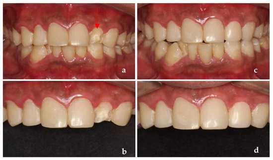 (a,b) One year after treatment; (c,d) After the dentist dealt with the new problem in time.