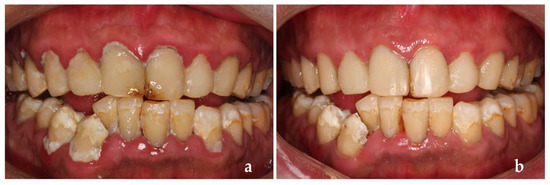 However, after this return visit, the patient was lost to follow-up for 3 years. Three years later (5 years after the first treatment), the patient came back with dental plaque covering the whole tooth surface, severe periodontal inflammation, many secondary caries and the retention, margin fitness and color matching of the restorations were poor (Figure 8a). Retreatment at this time could not achieve a perfect therapeutic effect (Figure 8b) and the reassessment of his caries risk this time was high risk again.