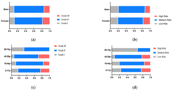 In terms of gender, the incidence of a high risk of caries and Grade III difficulty of treatment was slightly higher in females than in males (Figure 10a,b). In terms of age, patients with Grade I difficulty and low risk of dental caries tend to decrease with age when they are younger than 59 years old, while those with Grade III difficulty and high risk of dental caries are more likely to be middle-aged people aged 45–59 years old (Figure 10c,d). According to the Occupational Classification Of the People’s Republic of China, Chinese occupations are divided into eight occupational groups (Table S3) [22]. The patients we included mainly had occupations in the first to sixth categories, with the first and second categories being the dominating ones (Figure 10e). Low-risk, Grade I treatment difficulty was more likely to be found in category 6 occupations, while high-risk, Grade III treatment difficulty was more commonly seen in category 1, 2 and 4 occupations (Figure 10f,g).