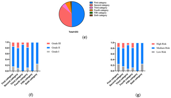 (a) Treatment difficulty grade proportion in gender; (b) Risk level proportion in gender; (c) Proportion of treatment difficulty grades in each age group; (d) Proportion of risk levels in each age group; (e) Proportion by occupation category; (f) Proportion of treatment difficulty grades in each occupational category; (g) Proportion of risk levels in each occupational category.