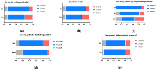 (a) Patients who like to drink carbonated drinks have a higher proportion of Grade III difficulty. (b) Patients who like sweets have a higher proportion of Grade III difficulty. (c) Patients who brush their teeth less than once a day have a higher proportion of Grade III difficulty. (d) Patients who go to the dentist regularly have a lower proportion of Grade III difficulty. (e) Patients who ever had orthodontic treatment have a lower proportion of Grade III difficulty.