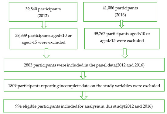 This study is based on data from two waves of the China Family Panel Studies (CFPS) from 2012 and 2016 (Figure 1). CFPS is a nationwide survey data covering 25 provinces, municipalities, and autonomous regions in China. It aims to reflect the changes in China’s society, economy, population, education, and health by tracking and collecting data at three levels: individual, family, and community, which provides a data foundation for academic research and public policy analysis. CFPS conducted a baseline survey in 2010 and conducts follow-up surveys every 2 years. CFPS uses face-to-face interviews, telephone interviews, and computer-assisted technology to obtain information about respondents’ personal, family, and community perspectives. Due to differences in depression measurement and cognitive measurement methods of CFPS in different years, in order to maintain the consistency of measurement standards, this study selected the data from 2012 and 2016 that were consistent in cognitive and depression measurement standards. At the same time, this study mainly focused on children who were able to autonomously answer questions about cognition and depression. Therefore, this study selected children aged 10–15 as the research sample. Ethical approval was granted by the institutional review board (IRB00001052-14010). All participants provided written informed consent [29].