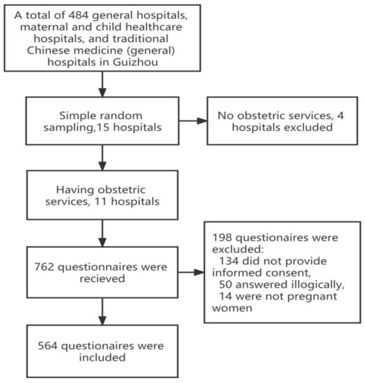 The information from the medical institutions in Guizhou province was obtained from the standard coding management system of China’s disease prevention and control information system. In total, 484 general hospitals, maternal and child healthcare hospitals, and traditional Chinese medicine (general) hospitals are registered under the health administration departments in Guizhou province. Of these, 15 hospitals were randomly selected through the method of simple random sampling using SPSS 22.0 software (IBM Corp. in Armonk, NY, USA). After a preliminary investigation of the medical institutions’ service content, 11 hospitals were included in the target organizations that carried out obstetrics and antenatal examination services. Among the 11 hospitals, 5 were state-owned and 6 were private, 1 was a tertiary medical institution, 5 were secondary hospitals, and 5 were first-level and below medical institutions. The eleven hospitals are located in the nine counties of Guizhou province, including five counties in the north (counties: Daozhen, Renhuai, Chishui, Hezhang, Qixingguan) and four counties in the center and south (counties: Xiuwen, Guanling, Kaili, Xingyi).
