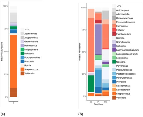 Identified bacteria genera and their relative abundances (% of total bacteria) by 16S rRNA sequencing (V5–V7). (a) Inoculum (I), (b) steady-state biofilms: peri-implant health (PH), peri-implant mucositis (PM) and peri-implantitis (PI).