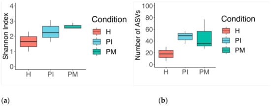 Steady-state biofilm boxplot (Tukey): (a) number of amplicon sequence variants (ASVs) showing the number of unique features detected in each sample, and (b) the Shannon index showing the degree of evenness between unique features (distributed within the community proportionality); increased richness and diversity found in the disease state.