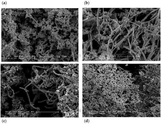 Scanning electron microscopy images showing microcosm biofilms from a CDFF 30-day peri-implantitis model. Biofilms were grown on machined Ti and sampled throughout the study period. (a) Represents 4-day-old biofilm grown under conditions emulating health (scale bar = 10 µm, magnification 3500×). (b,c) Represents 9- (b) (scale bar = 5 µm, magnification 5000×) and 15-day (c) biofilms after the induction of peri-implant mucositis conditions (scale bar = 10 µm, magnification 3500×). (d) Represents a 30-day biofilm under peri-implantitis conditions (scale bar = 20 µm, magnification 1000×).