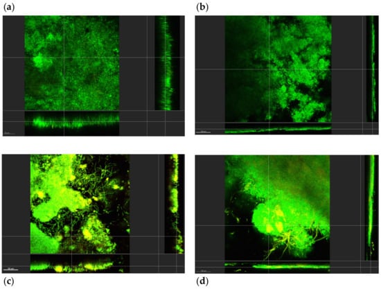 Confocal laser scanning microscopy images of microcosm biofilms grown on top of Ti surfaces at selected sampling points (4, 9, 15, and 30 days post-culture). SYTO9® stained the live bacteria green while propidium iodide stained the dead bacteria red. As in the case of the SEM micrographs, the CLSM images of biofilms under health conditions on day 4 (a), peri-mucositis on days 9 and 11 (b,c), and peri-implantitis at 30 days (d) show similar bacterial growth features (x–y–z planes). The vertical view represents y–z and the sagittal view represents x–z; images were taken through layers of the z-axis.