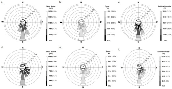 The weather conditions data considering wind speed and direction, relative humidity, and temperature of the Dairy B and Feedlot C were plotted using AERMOD and presented in Figure 1. The majority wind speed in Dairy B ranged from 2.6 m s−1 to 7.8 m s−1 for 71.7% of the time and wind direction was mostly from the South and South Southeast (120° < θ < 180°) for about 47.8% of the time. The mean relative humidity and temperature in the dairy facility were 69.2% and 30.2 °C during the sampling week. Feedlot C had the predominant wind direction from the south, more specifically at an angle of between 120° < θ < 240° of north, for about 83.7% of the time. The direction was reflected in the onsite data during the sampling time as well. The majority of the wind speed was around 7.50 m s−1 for 44.4% of the data with an average wind speed of 6.3 m s−1 while the average temperature was 26.3 °C. Alongside hoofing or cattle activities, meteorological conditions play a stellar role in PM formation, size distribution, transportation, and settling [7,29]. The impact of precipitation and wind speed and direction on the PM emission and dispersion was also previously studied elsewhere [30].
