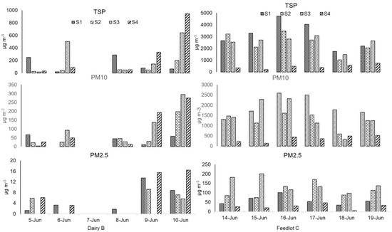 Mean diurnal TSP, PM10, and PM2.5 concentrations (μg m−3) during sampling hours in Station 1 of Feedlot C.