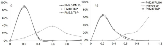 PM ratio for the collected emissions from Feedlot C (a) and Dairy B (b). (x and y axis represents ratio and % data fallen in that ratio, respectively).