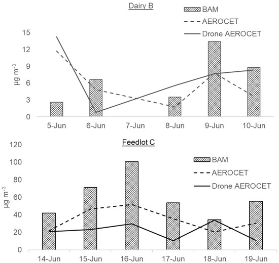 Daily 1-hr mean emission concentration (μg m−3) in each station for Dairy B (9 a.m. to 5 p.m.) and Feedlot C (8 a.m. to 6 p.m.).