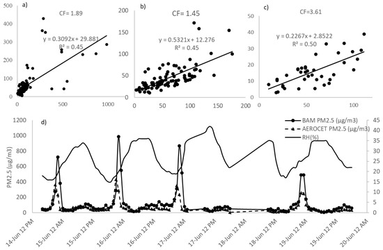 BAM PM2.5 emission correlation with (a) AEROCET samples, (b) outlier removed AEROCET samples, (c) drone AEROCET samples, and (d) continuous comparison of BAM and AEROCET emission from Feedlot C along with relative humidity.