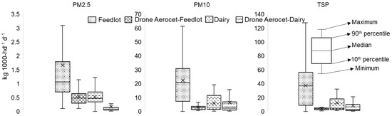Since the study also focused on the utilization of a simple emission measurement technique, the overall EF for collocation of the FRM sampler and low-cost samplers is presented in Figure 7 for comparison. The box plots’ mean PM emissions were always higher than the drone AEROCET values for both the dairy and the feedlot. The developed conversion factor for the AEROCET and drone AEROCET data may have applicability to some extent to solve this difference. Moreover, the mean Feedlot PM2.5 EF was close to the 90th percentile due to positive skew from the variations in the diurnal emissions. TSP and PM10 mean EF for feedlot was close to their median values attributing to the somewhat normal distribution. The drone AEROCET EF for both dairy and feedlot showed a slightly positively skewed distribution. The dairy EF for all PM emissions was positively skewed. However, the trend for overall mean EF distribution may attribute to the data accuracy.