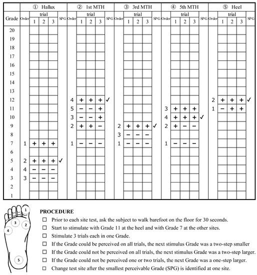 - Jeng, C.; Michelson, J.; Mizel, M. Sensory thresholds of normal human feet. Foot Ankle Int. 2000, 21, 501–504. [Google Scholar] [CrossRef]