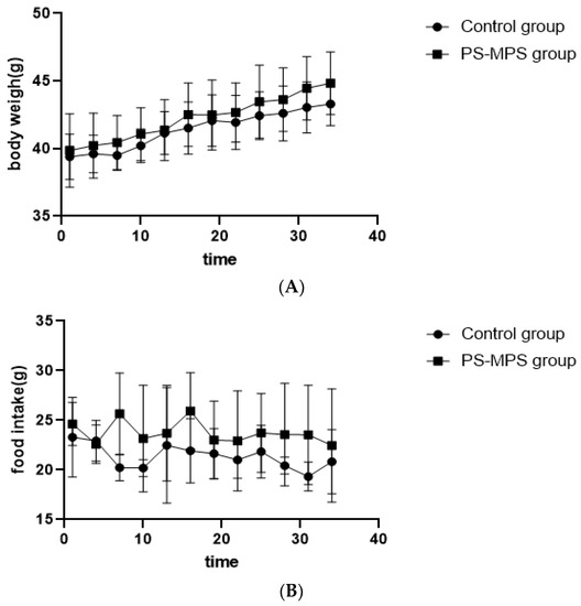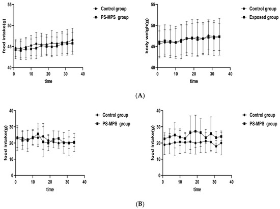 As shown in Figure 1, during the 35 days of exposure, there was no statistically significant difference in the body weight, food intake, and organ weight or coefficient over time between the exposed and control groups. The organ weight and coefficient are shown in Table S3, Supplementary Materials.