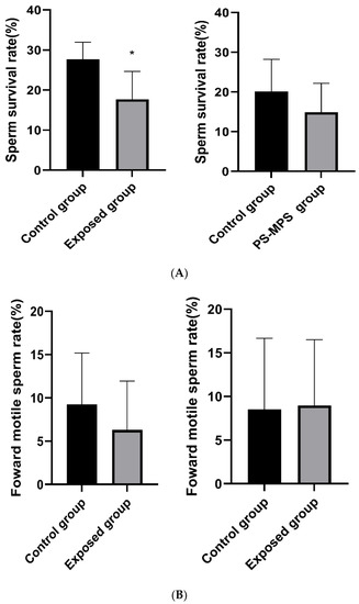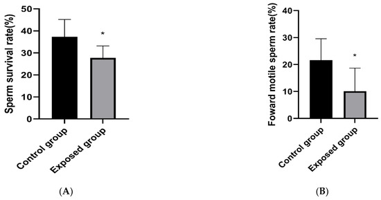 As shown in Figure 2A–C, after exposure, compared with the control group, the sperm survival rate, forward motility, and malformation rate of mice in the exposure group were decreased, and the differences were statistically significant.